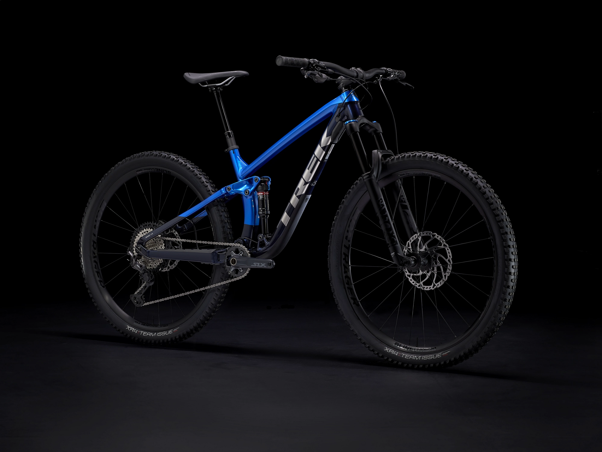 Einen Aluminiumrahmen, eine FOX Rhythm 34 Federgabel mit 140 mm Federweg und einen 130-mm-Dämpfer mit besonders effizienter RE:aktiv-Dämpfung. Dazu gibt‘s einen Shimano XT 1×12-Antrieb mit einem extragroßen Klettergang mit 51 Zähnen, kraftvoll zupackende 4-Kolben-Scheibenbremsen, Carbonlaufräder von Bontrager mit Rapid Drive-Hinterradnabe mit 54 Zähnen für einen schnellen Kraftschluss und eine Bontrager Line Variosattelstütze.