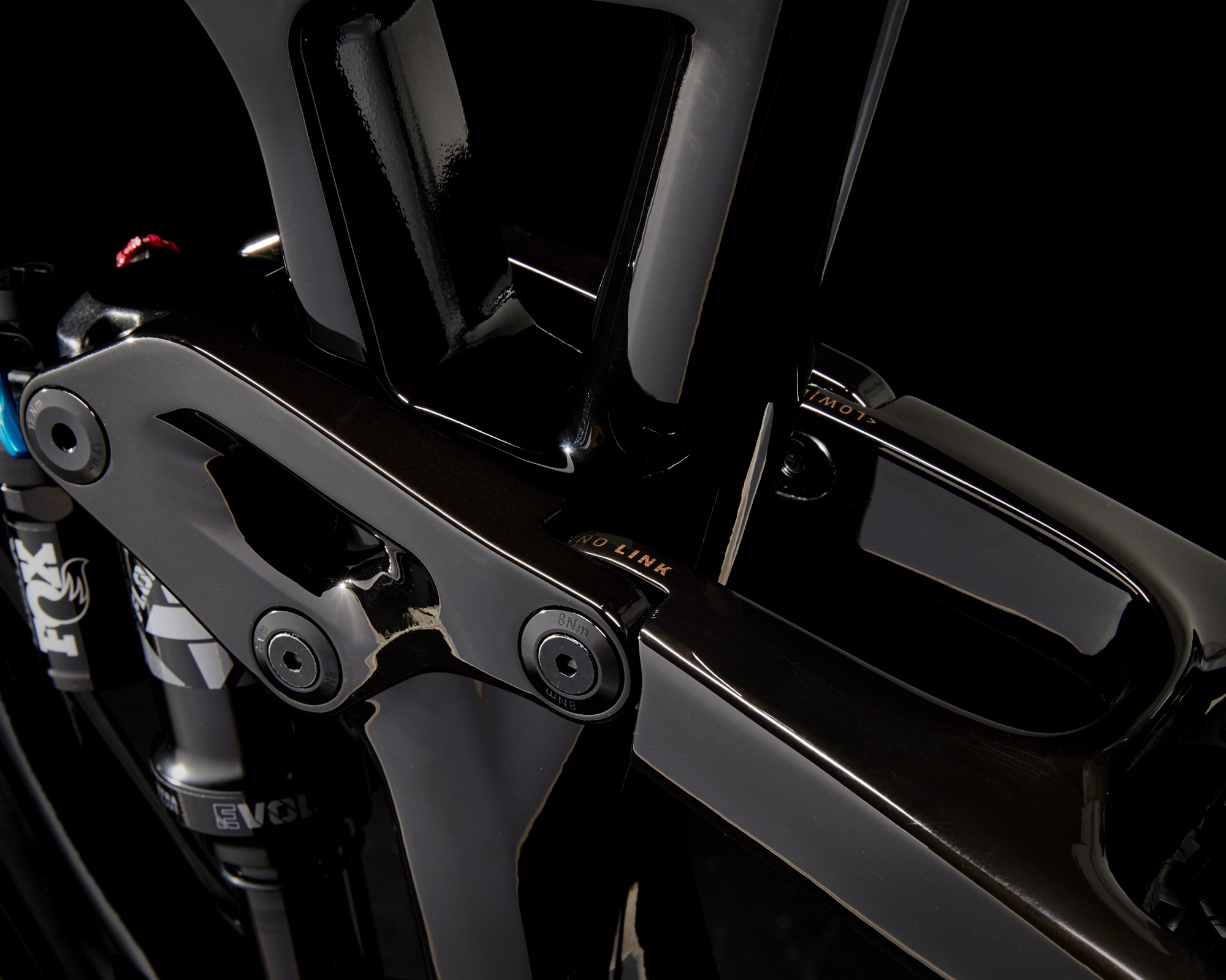 Rahmen: OCLV Mountain Carbon, integriertes Staufach, verstellbarer Steuersatzwinkel, per Mino Link abstimmbare Geometrie, einstellbare Progression, geführte interne Zugverlegung, Magnesiumumlenkhebel, 34,9 mm Sitzrohrdurchmesser, ISCG 05, 55 mm Kettenlinie, BSA 73, Unterrohrschutz, Shuttle-Guard, ABP